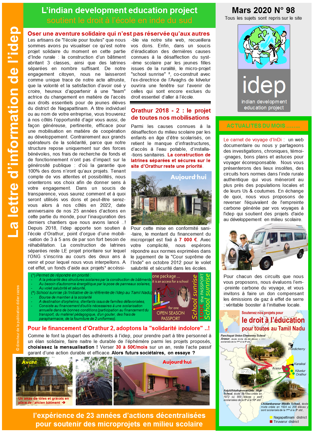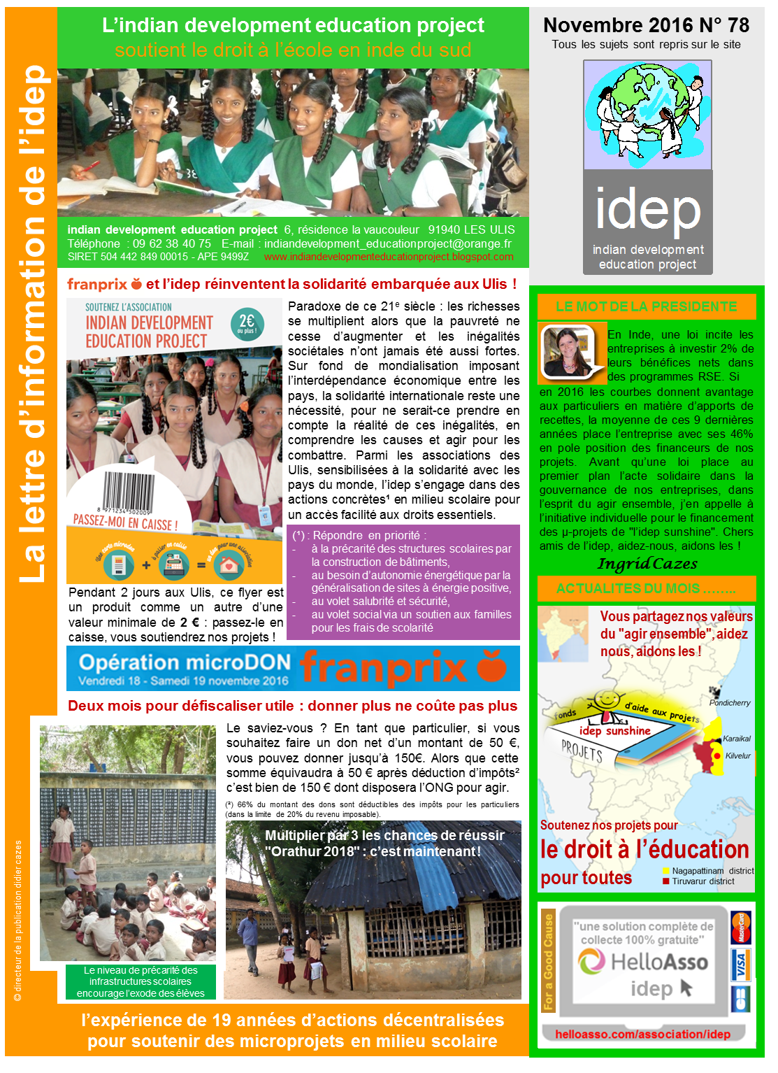 Pour joindre l'ONG : indiandevelopment_educationproject@orange.fr ou indian development education project 6 résidence la Vaucouleur 91 940 Les Ulis (France).